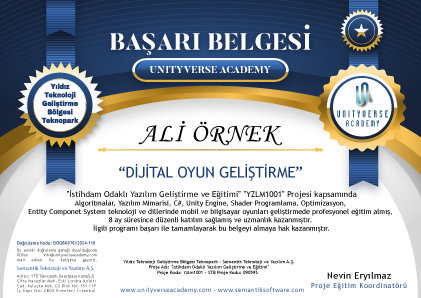Eğitimi tamamlayan öğrenciler; sektörün en saygın sertifikalarından biri olan “Unityverse Mobile Application Development A+” sertifikasına sahip olacaktır. Bu sertifika, yeteneklerinizi ve becerilerinizi uluslararası düzeyde tanıtarak, işverenlerin dikkatini çekecektir.