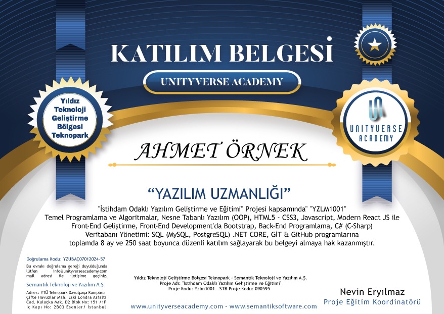 Unityverse Akademi, sizleri sadece bir yazılım uzmanı yapmakla kalmayıp, aynı zamanda aranan ve donanımlı bir profesyonel haline getirmektedir. Siz de yazılım uzmanlığı alanında kariyer yapmak istiyorsanız, bizlerle iletişime geçmekten çekinmeyin.